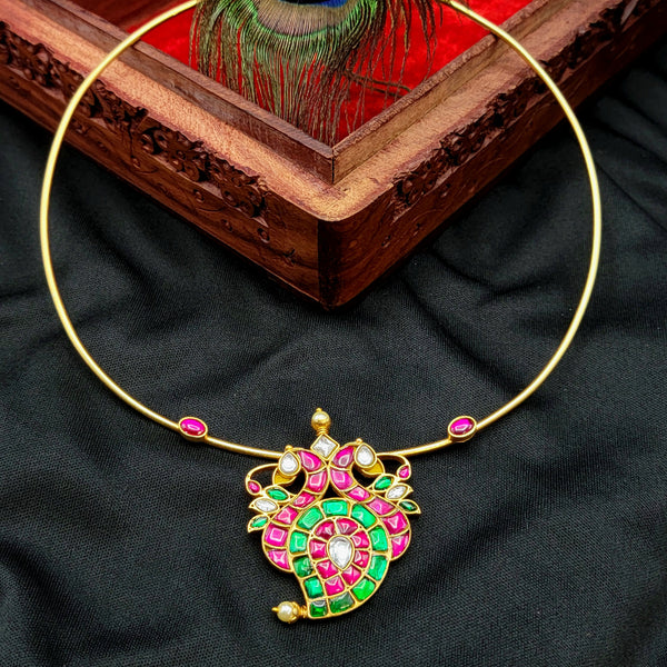 This is a classic Jadau Kundan Necklace that comes with peacock and floral design. The necklace comes with bunch seed beads pearl mala and stands close to the neck. The pearl mala is completely removable.