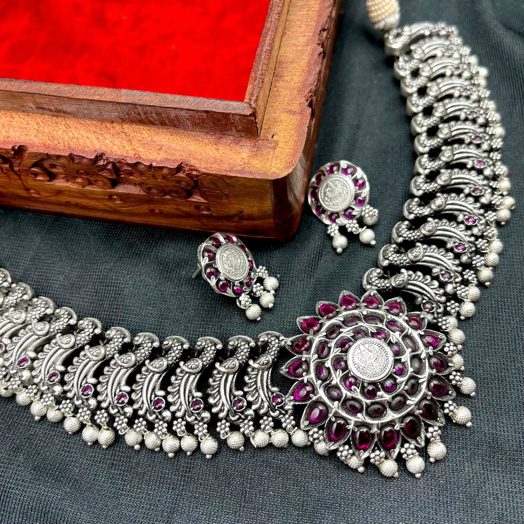 This is a very unique matte finish pure silver alike Lakshmi coin and peacock motif necklace that is studded with original kemp stones.