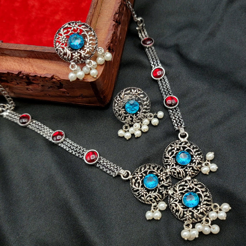 This is a super cute sma necklace set in oxidized silver that is complemented with light blue and Kemp red stones. This is best suitable for kids and for all ages.